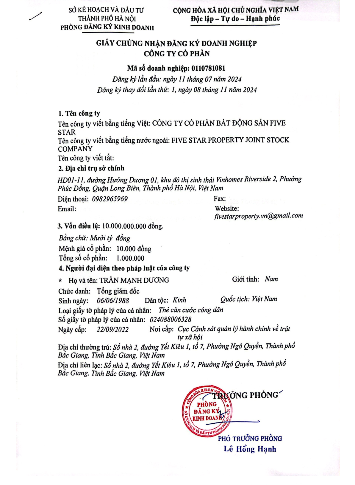 – Mã số doanh nghiệp: 0110781081